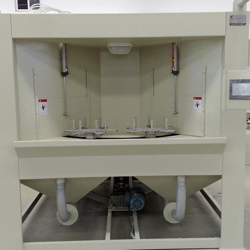 E:噴槍可任意擺動,能調(diào)節(jié)速度及出砂量,大轉(zhuǎn)盤采用接近開關控制定位,定位精確,每次旋轉(zhuǎn)一個工位90°,每個工位清理1個工件,可間歇連續(xù)長時間工作